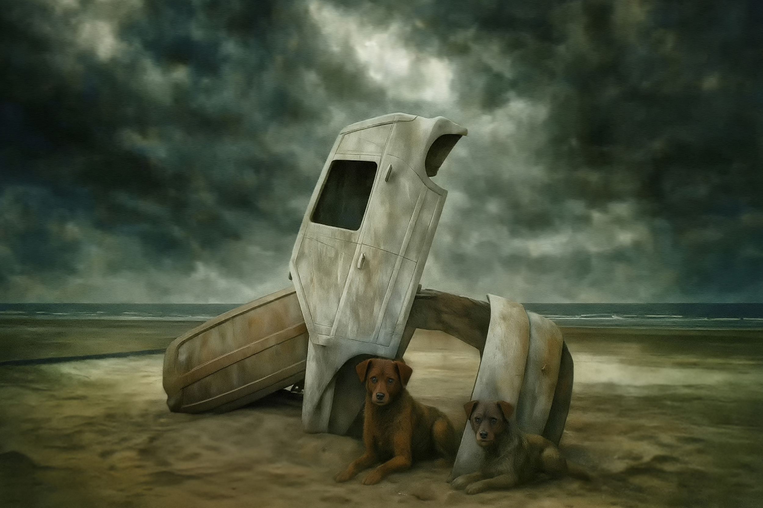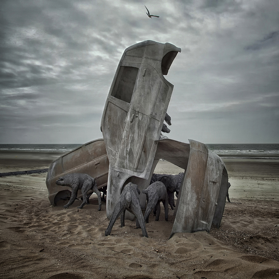 As you can see, the car wrecks were surrounded by metallic dog sculptures.